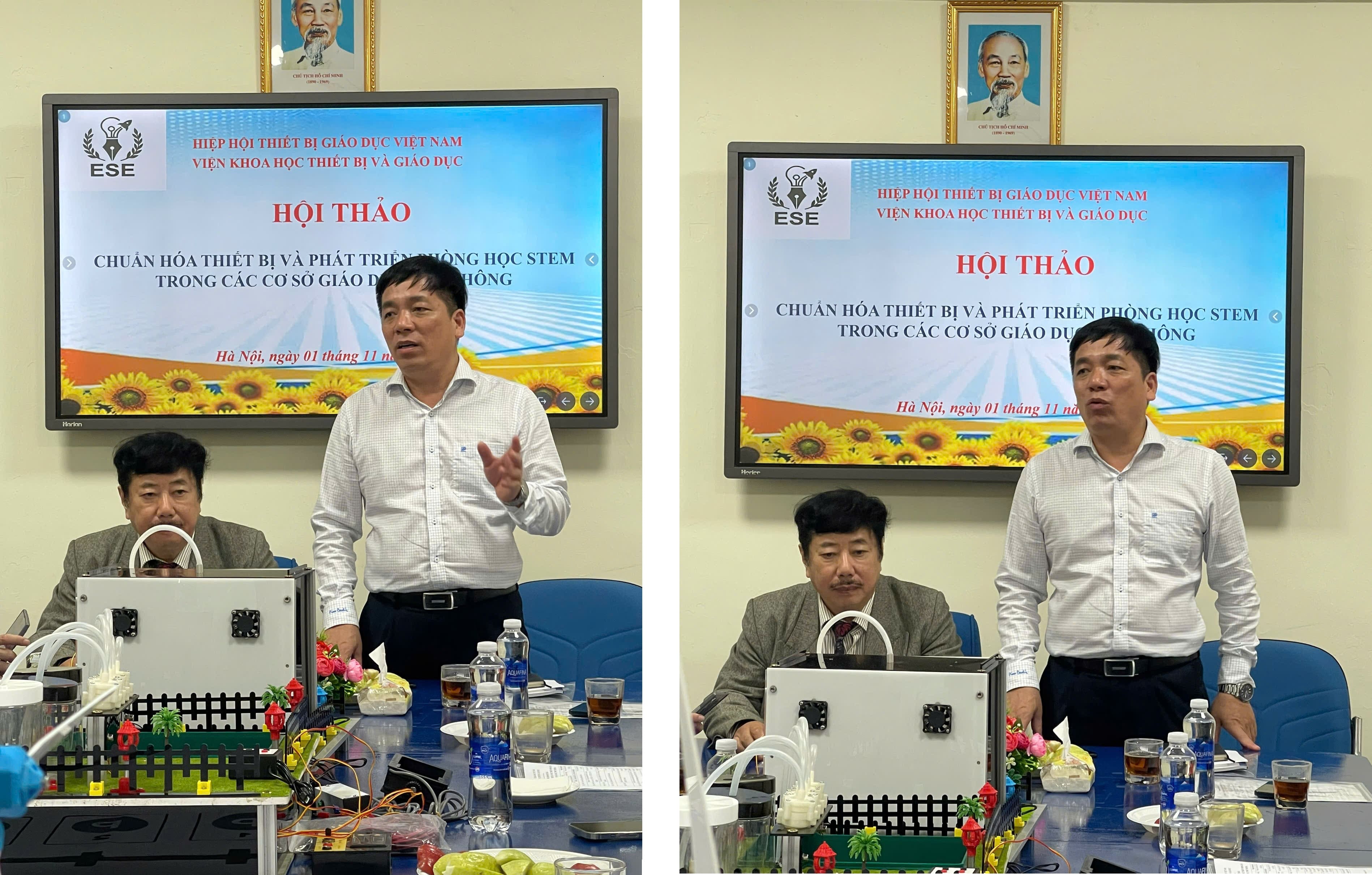 Hình ảnh TS. Trần Dương Đạo - Viện trưởng Viện Khoa học Thiết bị và Giáo dục (bên trái) và ông Nhữ Ngọc Minh - Chủ tịch Hiệp hội thiết bị Giáo dục Việt Nam, Chủ tịch hội đồng chuyên môn (bên phải).